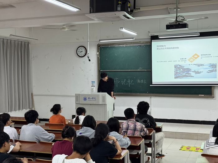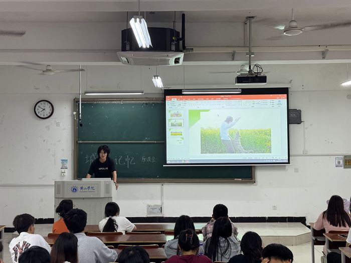 活动现场,五位同学依次登台分享。24新闻一班曹煜浩展示在黄山拍摄的独特记忆照片,唤起人们对黄山美景的向往;24数科班戴星冉回顾高中生活,讲述难忘的校园故事,引发在场同学共鸣;24环艺班赵维豪分享骑摩托的潇洒瞬间,以及与小动物相处的温暖时刻,展现别样生活情趣;24戏文班宣海曈通过随笔与展示,将家乡合肥的风貌生动呈现;24新闻一班陆天琪则以镜头聚焦宏村粉墙黛瓦的古建筑,带大家领略徽派建筑之美。同学们以自身经历与感悟为引,让一个个鲜活的城市记忆跃然眼前。