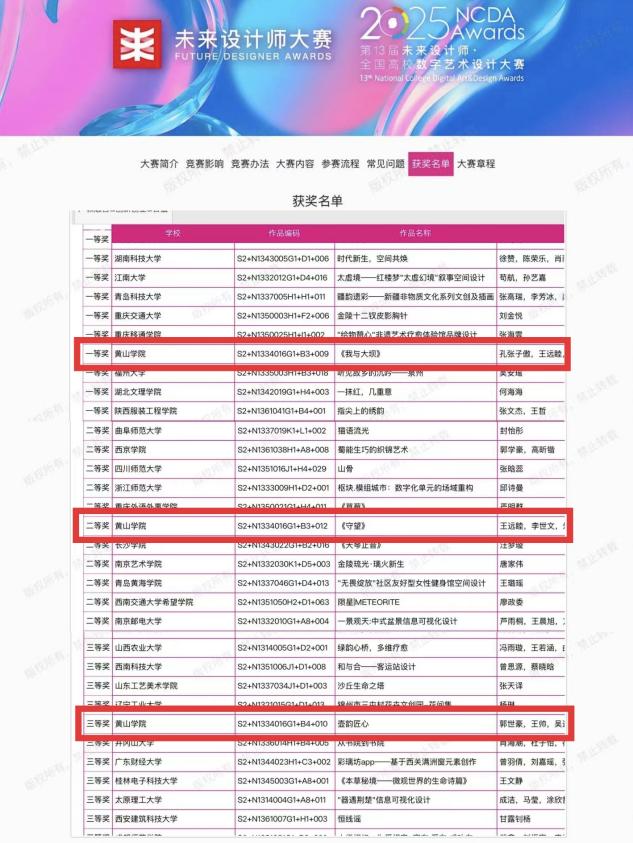 8月26日下午,第13届未来设计师·全国高校数字艺术设计大赛(NCDA)国赛评选结果正式公布,黄山学院yl7703永利官网师生表现优异,共获国家级一等奖1项、二等奖1项、三等奖1项。