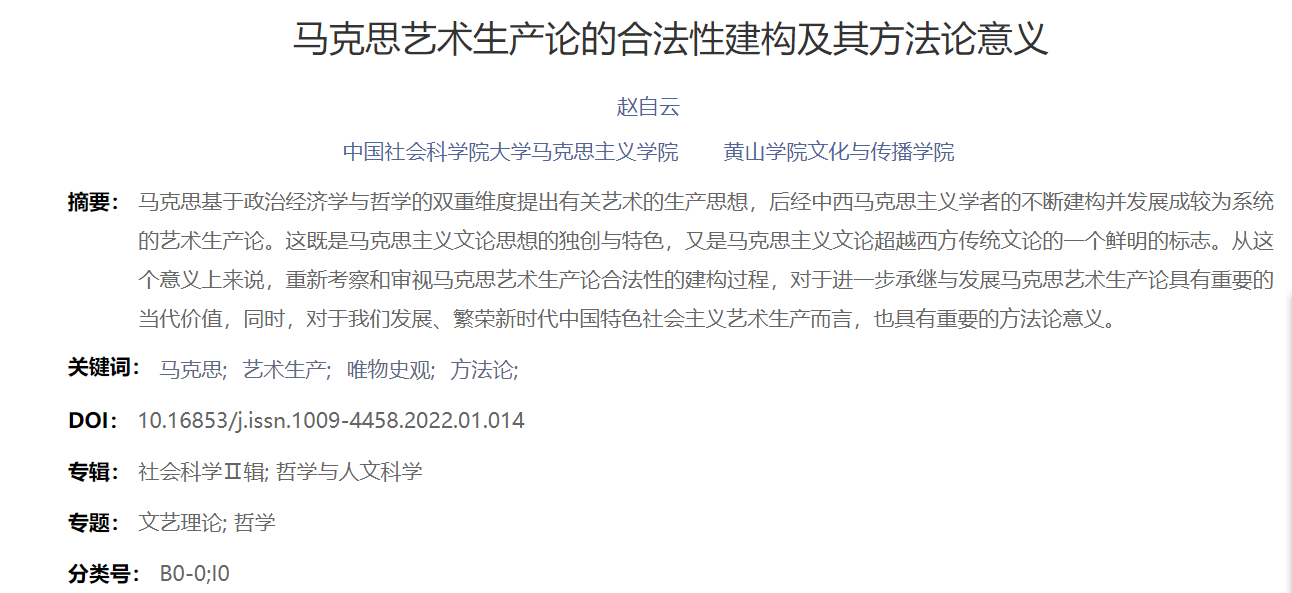 赵自云在《内蒙古农业大学学报(社会科学版)》2022年第1期发表论文《马克思艺术生产论的合法性建构及其方法论意义》,在《荆楚学刊》2022年第3期发表论文《理论旅行视阈下马克思艺术生产论的跨文化再生产》,两篇论文均为赵自云目前攻读博士期间的阶段性研究成果。